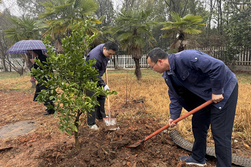 活动当天,公司园区内一派热火朝天的景象。绵绵春雨中,党员及入党积极分子们分工有序、默契配合:有人挥锹铲土,为树苗“安家”开垦沃壤;有人肩扛手抬,将四株苗木稳妥运送至种植点;最后细致培土压实,确保每一棵树苗扎根稳固。三株象征坚韧与希望的山茶花树、一株寓意硕果累累的橘子树,在众人协力下昂然挺立于园区绿地,为春日的聚芯增添勃勃生机。